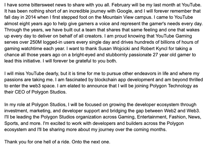 Ini adalah berita pahit untuk dibagikan bahwa saya akan meninggalkan @YouTube. Saya menyukai setiap menit waktu saya di sini, tetapi sekarang saatnya untuk usaha saya berikutnya. Saya senang mengumumkan bahwa saya akan bergabung dengan @0xPolygon ($MATIC) sebagai CEO Polygon Studios mereka. Terima kasih untuk kenangannya!