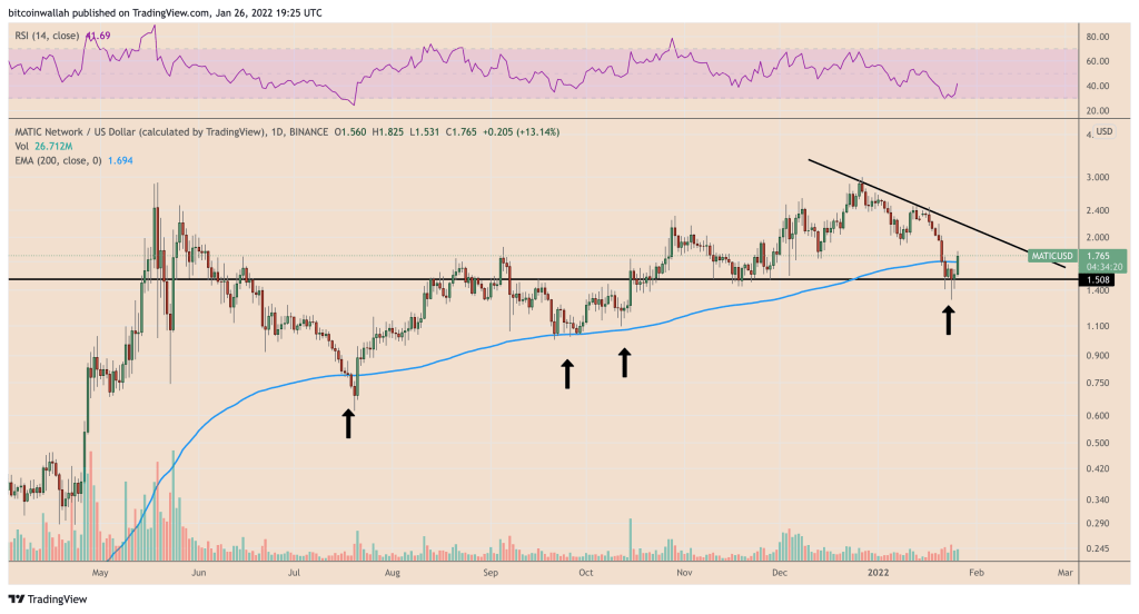 Pada 25 Januari, bull MATIC berusaha untuk merebut kembali EMA 200-hari sebagai support hampir seminggu setelah kehilangannya. Penurunan dan pemantulan di sekitar gelombang biru tampak sangat mirip dengan aksi harga pada periode Juli-Agustus tahun lalu, di mana penutupan di atasnya telah menyebabkan kenaikan harga 200%-plus.