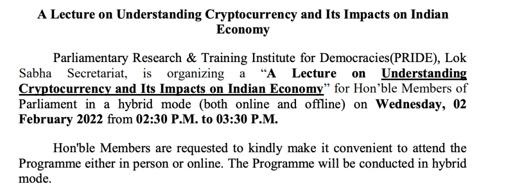 Buletin terbaru yang mencakup agenda majelis rendah parlemen India mencakup “kuliah tentang pemahaman cryptocurrency” dan dampak ekonominya.